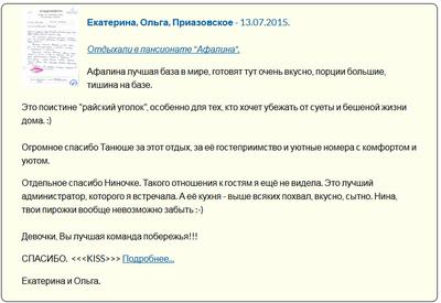 Отдельное спасибо Ниночке. Такого отношения к гостям я ещё не видела. Это лучший администратор, которого я встречала. А её кухня - выше всяких похвал, вкусно, сытно. Нина, твои пирожки вообще невозможно забыть :-)