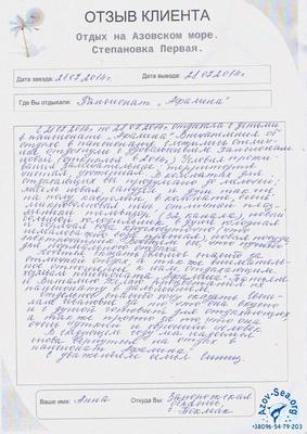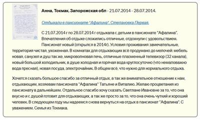 Хочется сказать большое спасибо за отличный отдых, а так же внимательное отношение к нам, отдыхающим, хозяевам пансионата "Афалина" Татьяне и Виталию. Желаю процветания из пансионату в дальнейшем. Отдельное спасибо хочу сказать Светлане Ивановне за то, что она вкусно и с душой готовит для отдыхающих, а так же просто за то, что она очень чуткий и хороший человек. В следующем году мы надеемся снова вернуться на отдых в пансионат "Афалина". С уважением. Семья из Токмака.