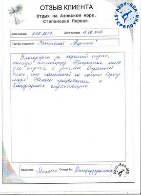 Благодарим за хороший отдых, теплую атмосферу. Прекрасное место для отдыха с детьми. Огромный плюс, что пансионат на самом берегу моря! Желаем процветания и благодарных отдыхающих.