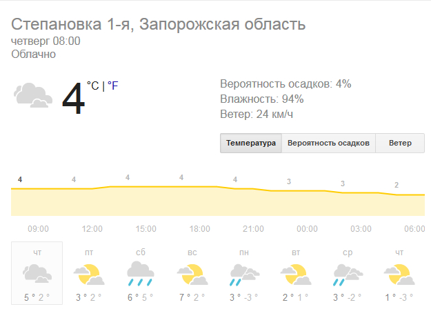 Как Вы видите утром в Степановке Первой был небольшой дождик. Дует достаточно сильный отдувной ветер. Влажность воздуха до 94%. Ветер 24 км в час.