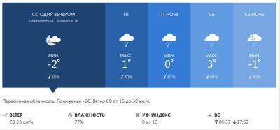 Ветер 16 км/ч Влажность62% Точка росы -4° Давление 1019.3 мбар Видимость 16.1 км