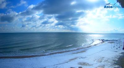 Потрясающую красоту можно было наблюдать на побережье Азовского моря 8-го февраля. Снег покрыл весь пляж и дворики пансионатов на побережье. На улице морозная погода и светит солнце. Такую картину можно наблюдать не часто на побережье.