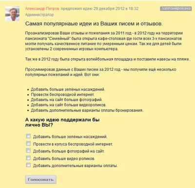 Просуммировав данные с Ваших писем за 2012 год - мы получили ещё несколько популярных пожеланий и идей. Вот они: