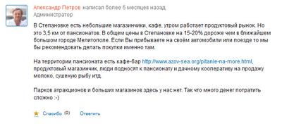 В Степановке есть небольшие магазинчики, кафе, утром работает продуктовый рынок. Но это 3,5 км от пансионатов. В общем цены в Степановке на 15-20% дороже чем в ближайшем большом городе Мелитополе. Если Вы прибываете на своём автомобили или поезде то мы бы рекомендовать делать покупки именно там.