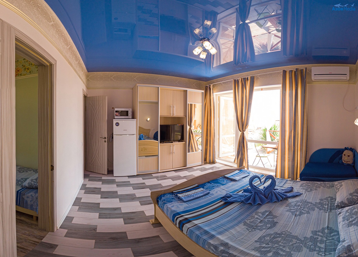 Однокомнатный «люкс» для проживания двух или трёх человек расположен на втором этаже здания. У номера есть совмещённая с соседним номером терраса, с которой открывается отличный вид на море. Вход в номер по лестнице левого крыла здания.